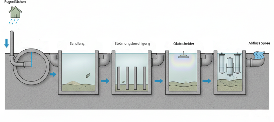 Das Regenwasser wird durch Regeneinläufe oder Dachrinnen über das Kanalnetz in die Anlage geleitet, wo es durch verschiedene Reinigungsstufen läuft. In einem Sandfang setzen sich schwere und grobe Partikel ab. Manchmal gibt es zusätzliche Filter oder Sedimentationszonen, die feinere Stoffe herausfiltern. Auch Schwimmstoffe wie Öl können über Ölabscheider zurückgehalten werden. Das so vorgereinigte Wasser kann anschließend deutlich schadstoffärmer in die Spree geleitet werden. Die jeweiligen Reinigungsschritte und Bauausführungen werden mit fortschreitender Planung festgelegt.